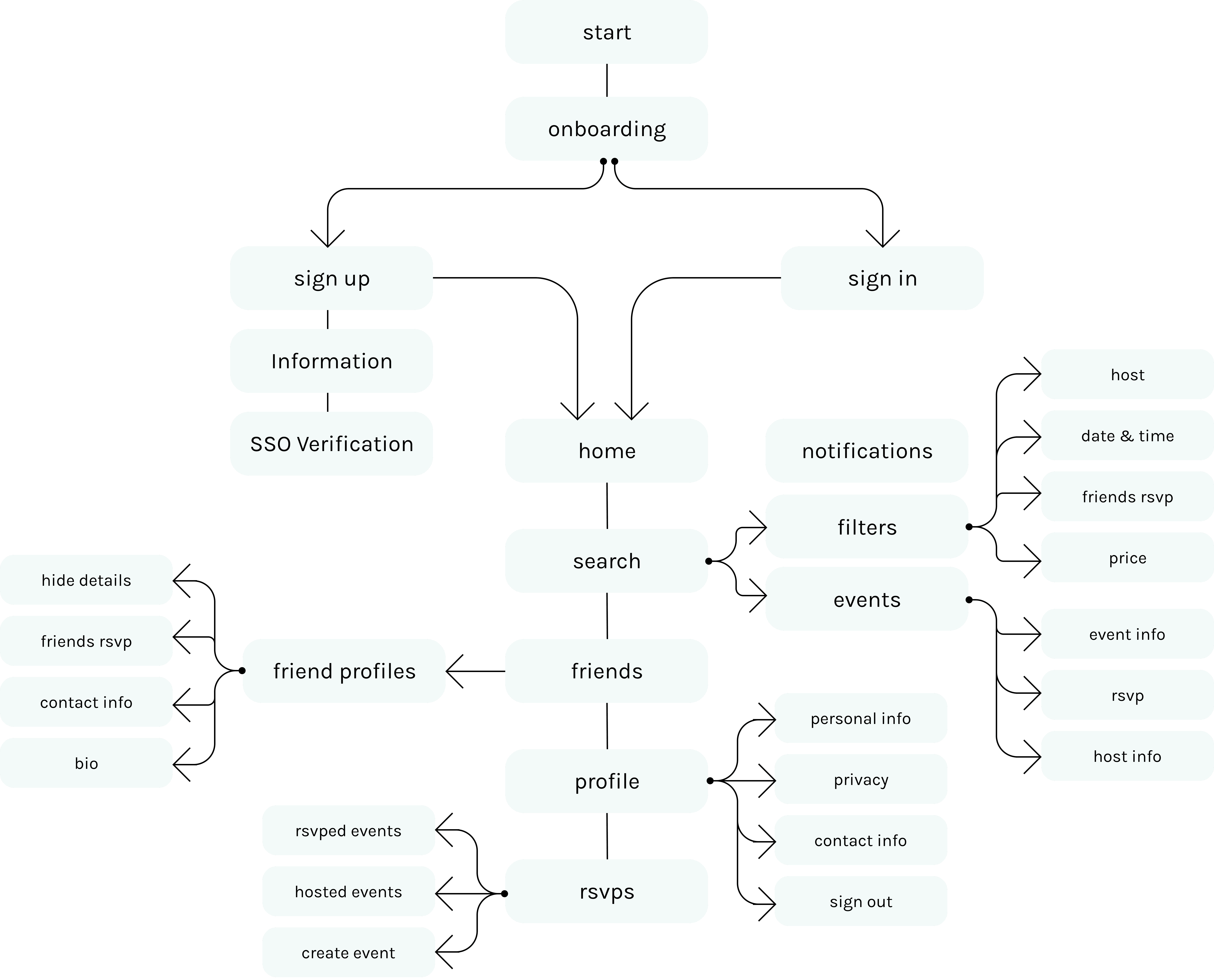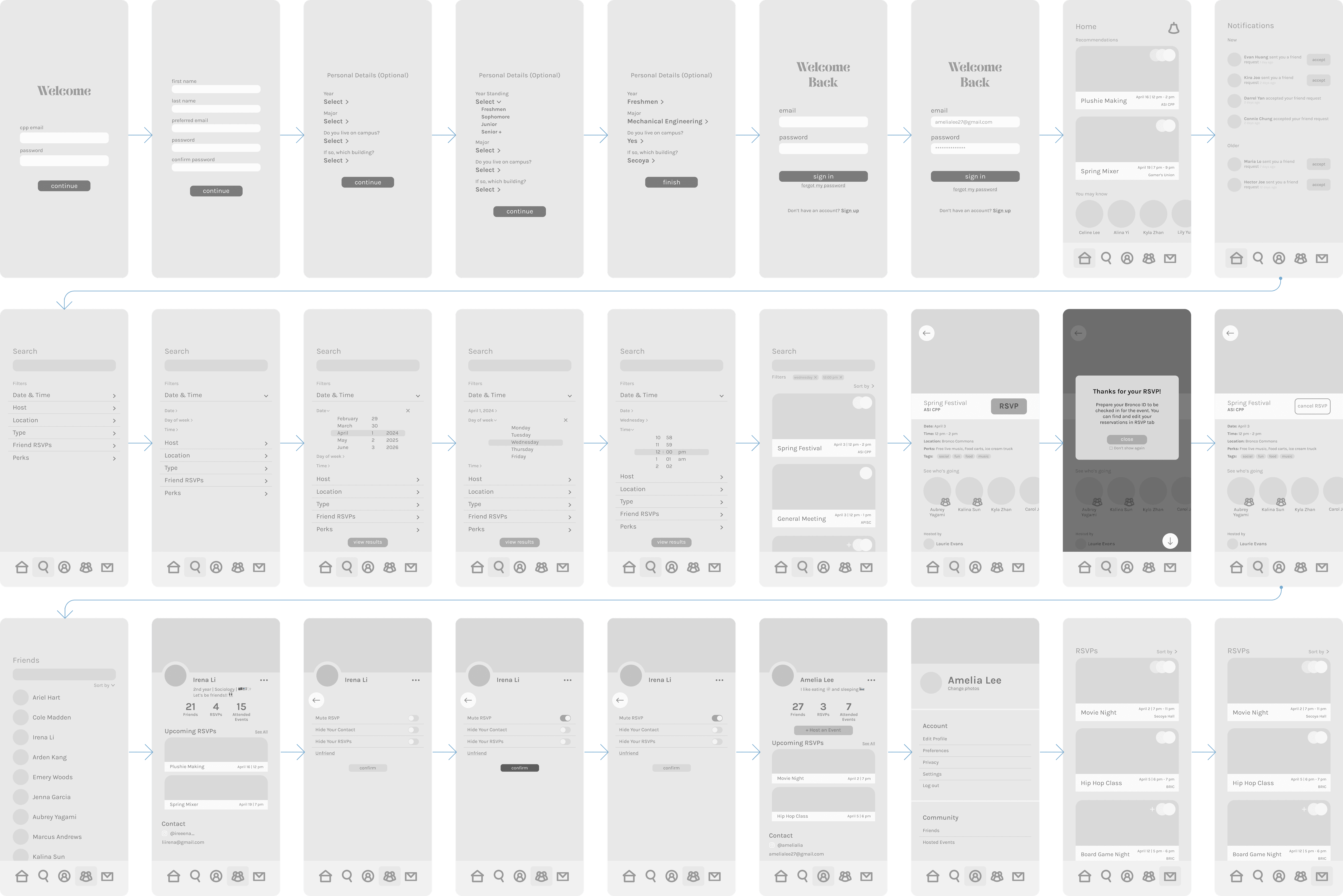 Our user flow chart maps out how students interact with Antifomo, ensuring a seamless experience from event discovery to RSVPing. Users start by building a profile, selecting interests, and receiving personalized event recommendations. They can browse, filter, RSVP, and see which friends are attending—all in a few taps.