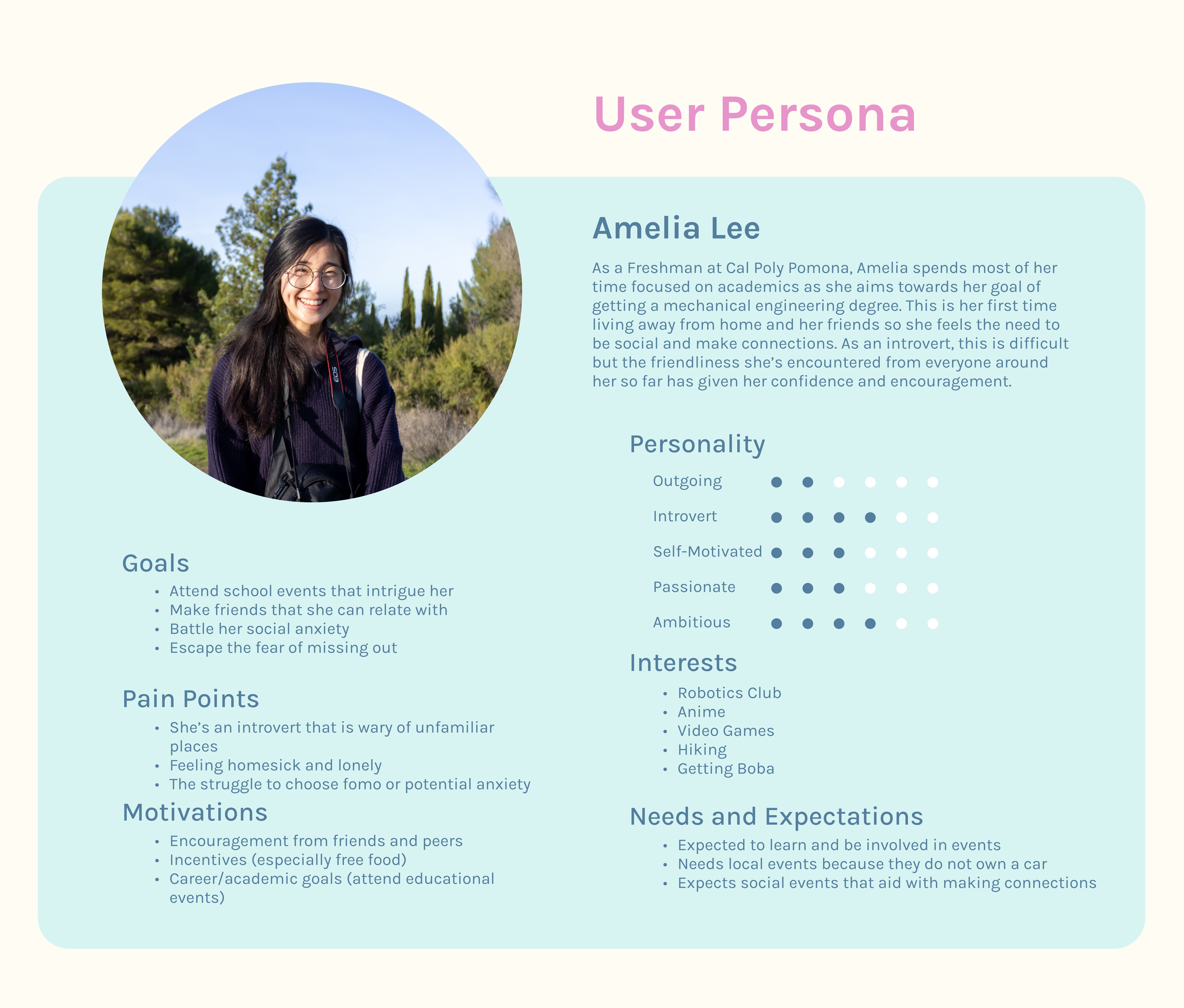 ASI and other CPP clubs and organizations have all their events posted in different places so it’s difficult for students to keep track of events they’re interested in going to. There’s no dedicated space for students to post about their own meetups, making it harder to find others with shared interests. As a result, students often hesitate to attend events alone.