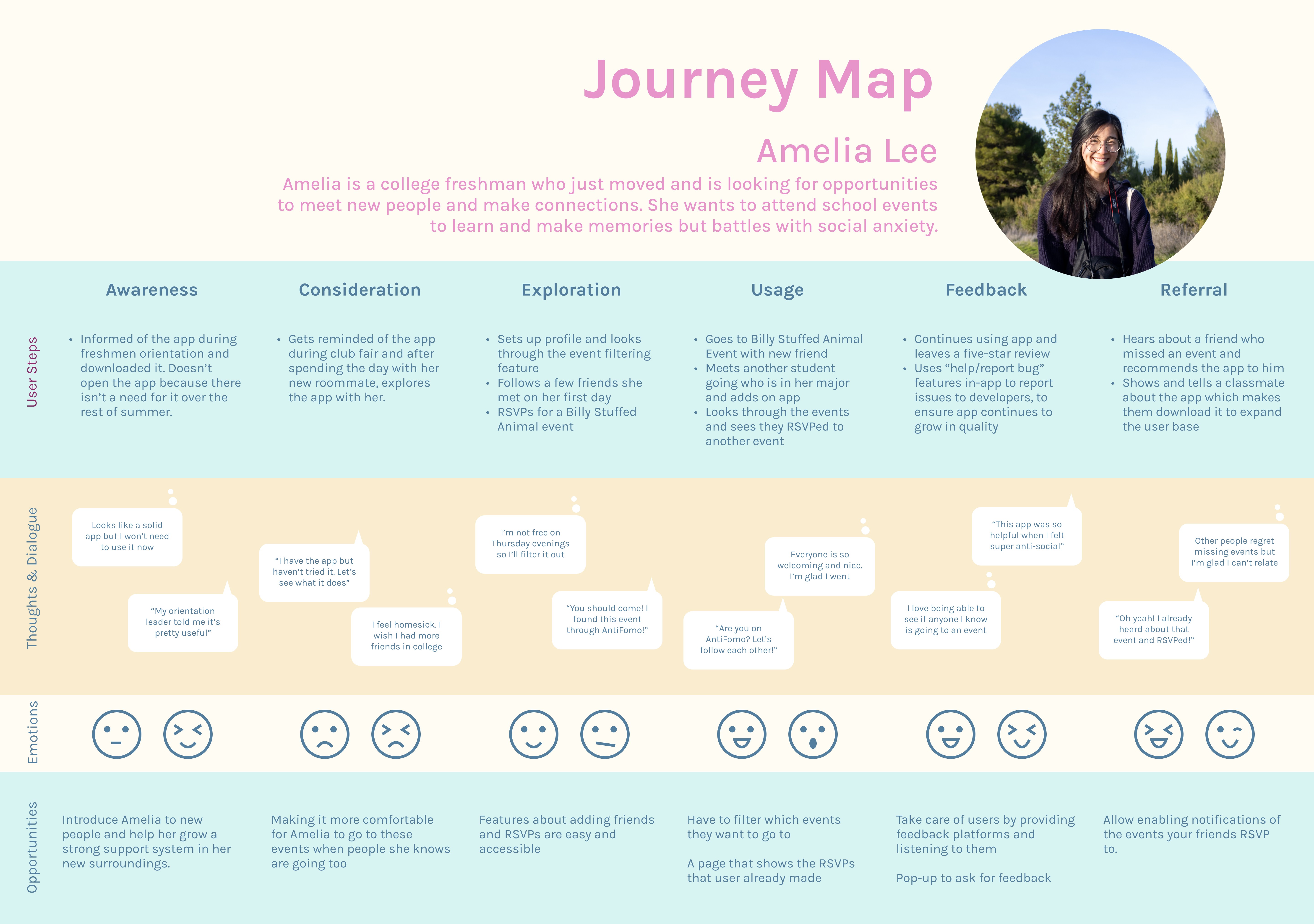 Our user journey map outlines the experience from event discovery to attendance, revealing moments of frustration (like missing an event due to poor visibility) and opportunities for improvement (such as personalized recommendations and friend-based RSVPs). By deeply understanding student behaviors and motivations, we refined Antifomo’s features to create a seamless and engaging event experience.