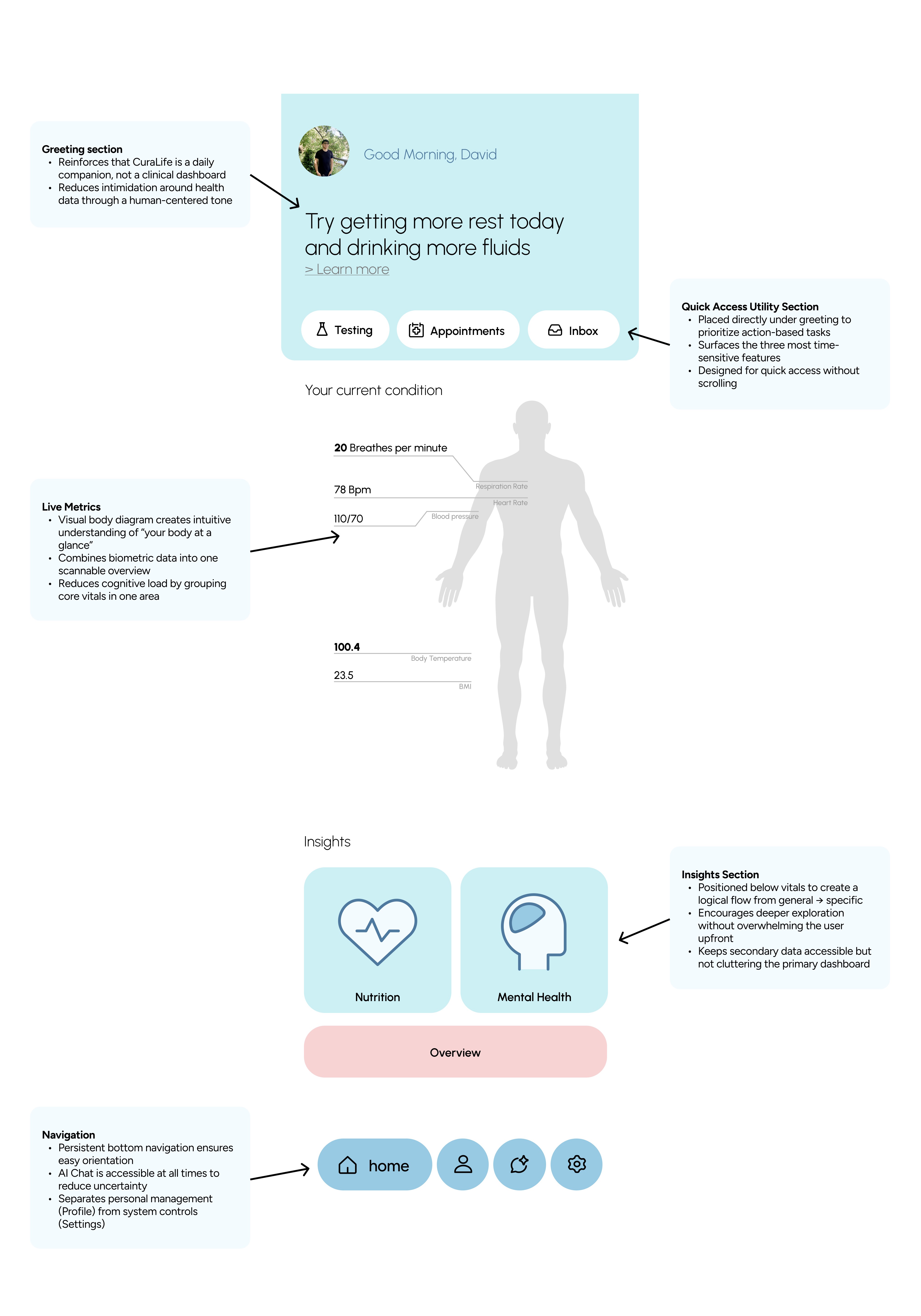 Designing the CuraLife home screen required translating complex health metrics into a structured, digestible experience. I prioritized task-based actions at the top, centralized live biometric data for quick scanning, and layered secondary insights below to maintain clarity. This intentional hierarchy ensures that users feel oriented, empowered, and supported.