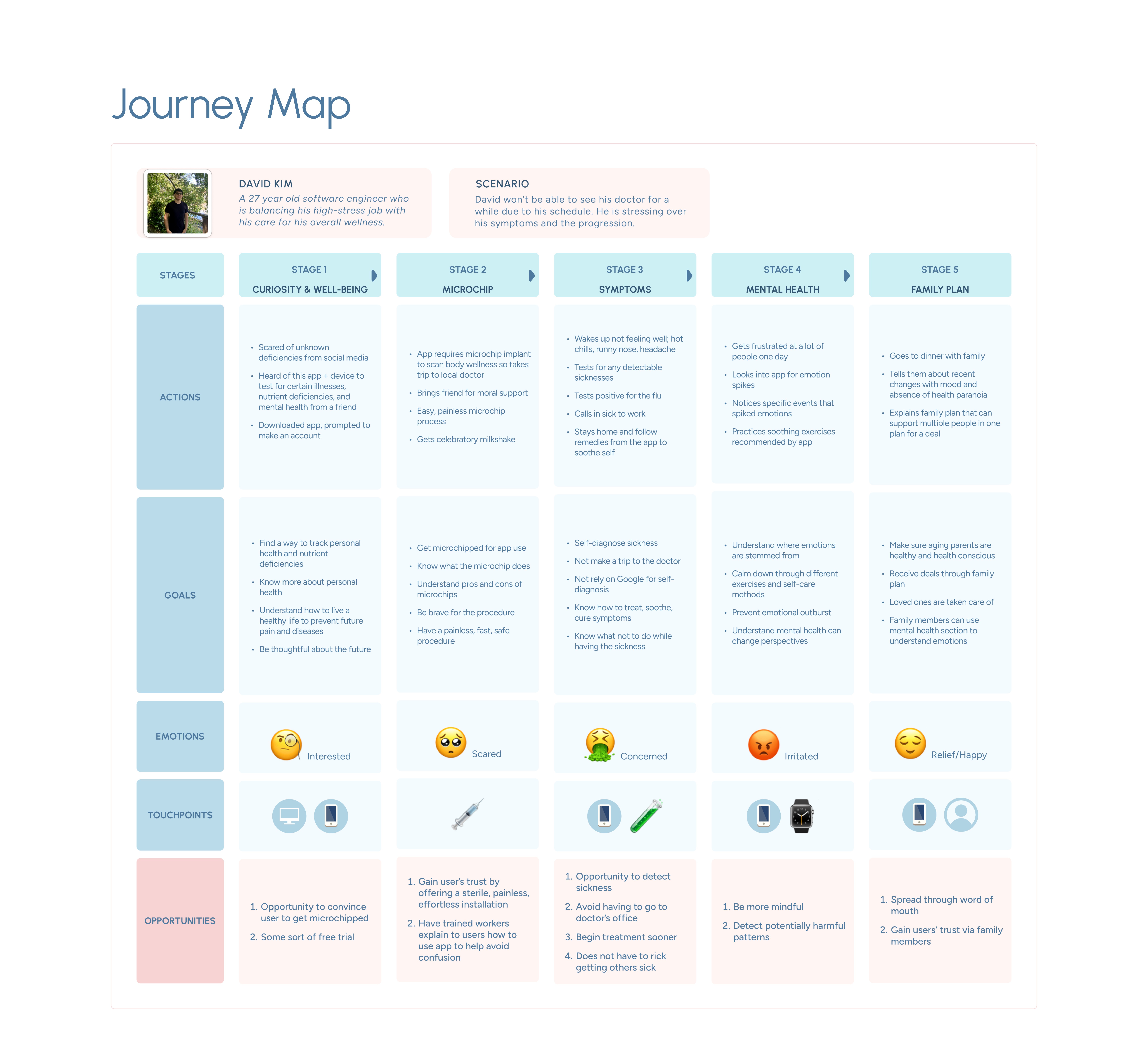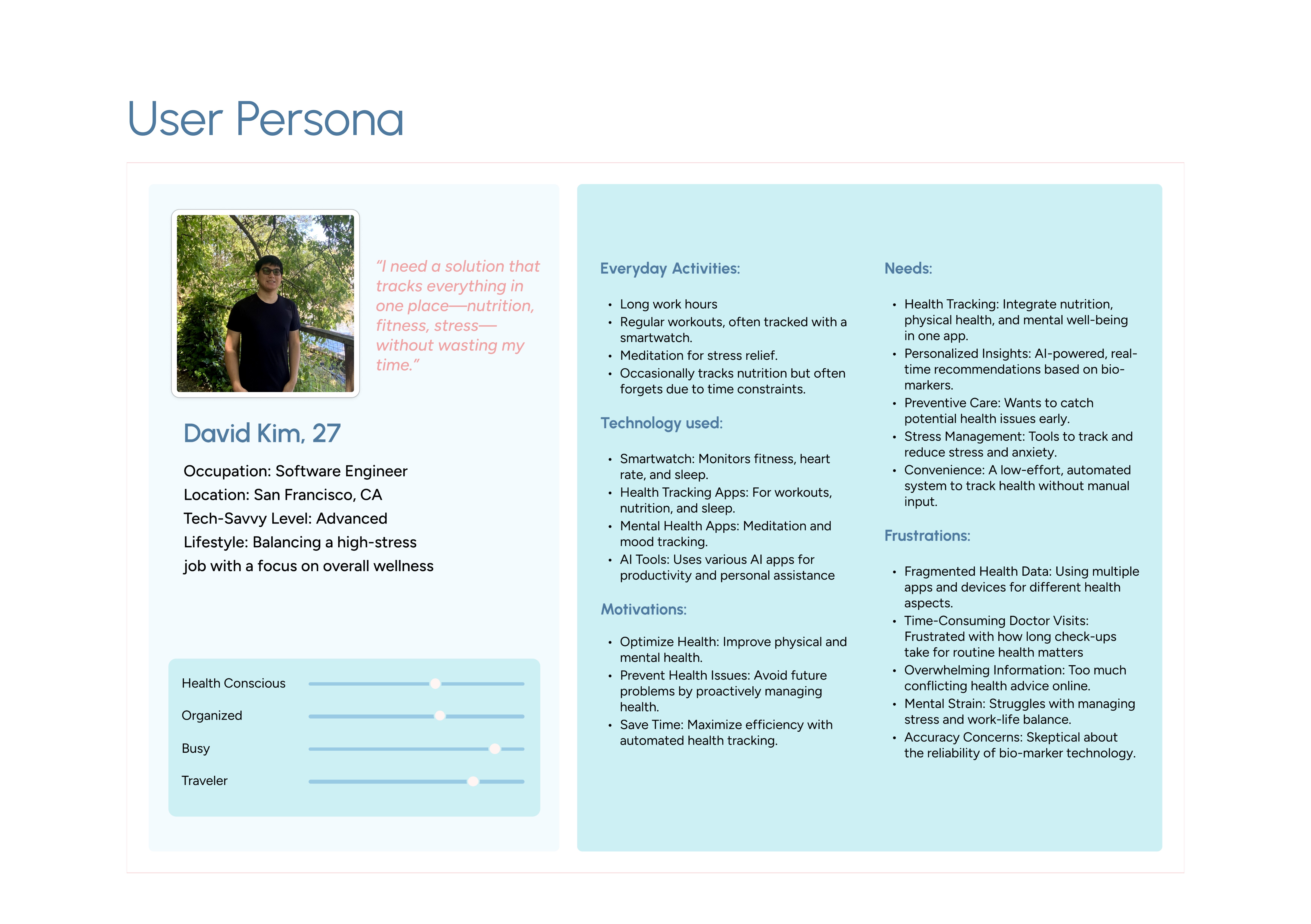 To validate our concept, we conducted user interviews to explore common frustrations with personal health management. We identified key pain points, such as the uncertainty of not knowing what’s happening in your body and the anxiety of googling symptoms while waiting for a doctor’s appointment. Based on our interview findings, we developed a user persona that reflected common frustrations—difficulty tracking personal health, uncertainty about symptoms, and reliance on internet searches for medical concerns. To deepen our understanding, we mapped out a user journey, illustrating their mindset from initial skepticism to growing trust in curalife.