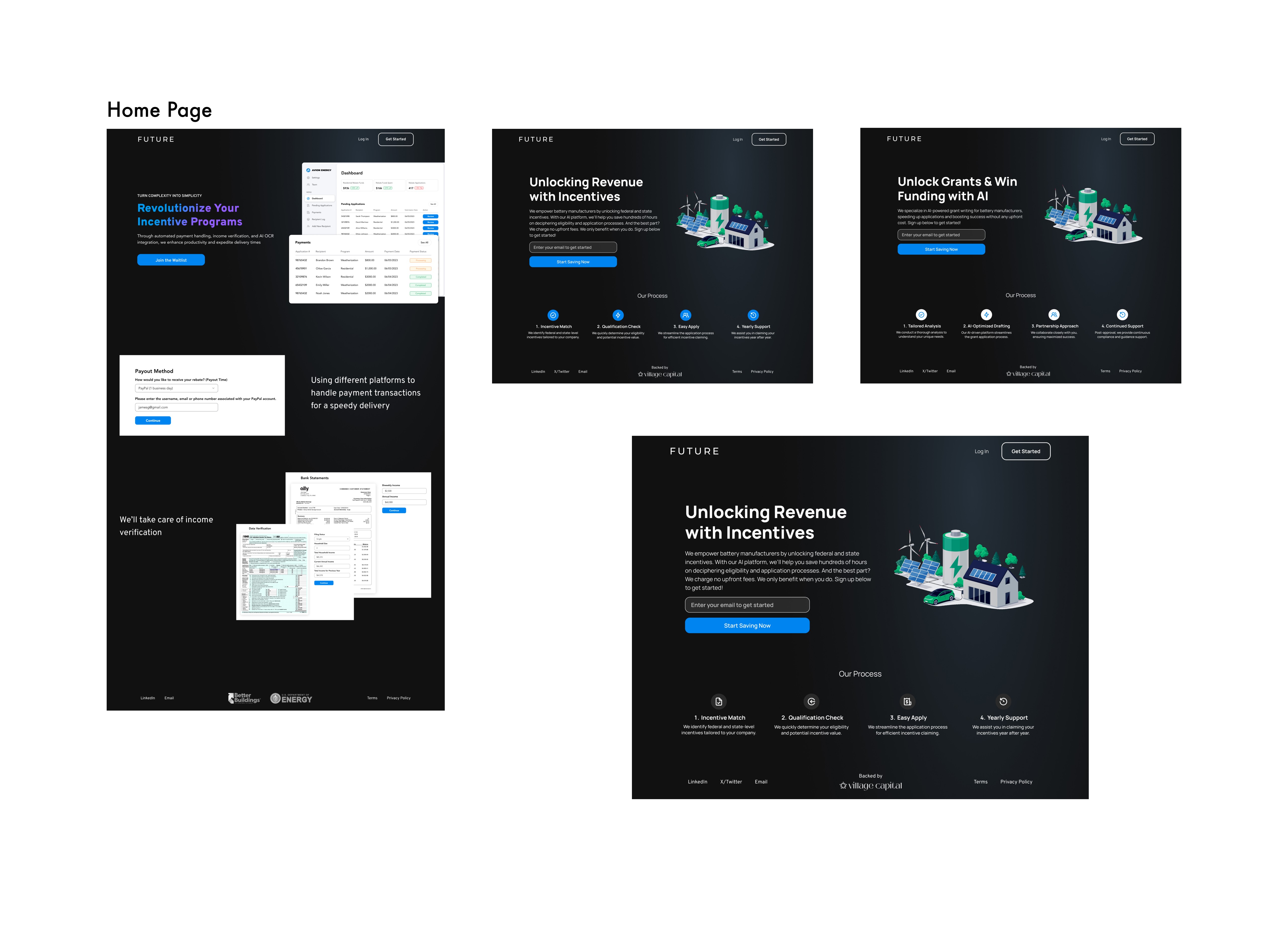 For the user flow, we designed screens that guided users through a seamless process of entering their tax returns and bank statements to determine eligibility for energy-efficient home improvement incentive programs. Users could also select their preferred digital payment method, allowing for a faster and more efficient rebate process. By streamlining these steps, we made it easier for homeowners and businesses to access incentives while reducing delays in receiving their payments.