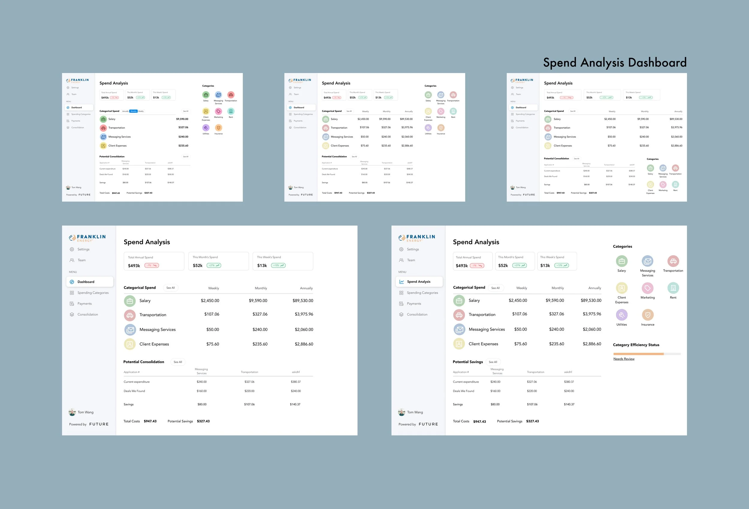 The dashboard serves as the central hub for users to track their program qualifications and rebate status at a glance. Designed for clarity and ease of use, it provides a comprehensive overview without overwhelming the user. Alongside the main dashboard, we explored a spend analysis feature, which was part of an early iteration when we considered expanding our services toward financial tracking. This section reflects the evolution of our product and how we adapted our design approach based on user needs and business goals.